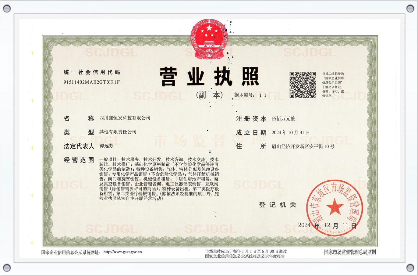 四川鑫恒发科技有限公司【属四川恒发气体有限公司子公司】新厂位于眉山市尚义镇经济开发区新区( 即西部药谷后面一公里),距离成乐高速眉山入口2.5公里,交通十分便利。公司业务遍及四川、重庆等地,在川渝两地享有盛誉,是成都市周边同行业企业中生产经营产品全面的企业。