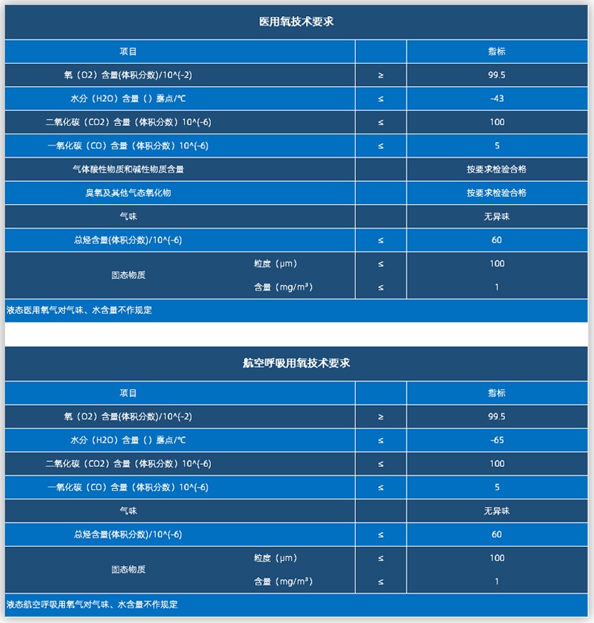 航空呼吸用氧的纯度要求非常高,通常含氧量应不小于99.5%,同时对其他成分如二氧化碳和一氧化碳的浓度也有严格的控制。例如,高压气氧的含氧百分比应不小于99.5%,二氧化碳浓度不得超过0.01%,一氧化碳浓度不得超过0.0005%。此外,航空呼吸用氧的含水量也有严格限制,通常在标准温度和压力条件下(15℃、101.3kPa),含水量应不大于5mg/m³,特殊情况下不超过20mg/m³。